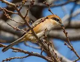 棕背伯劳 是伯劳中体形较大的种类。体长达240毫米左右。主要特征是头顶到上背部为灰色,向后渐沾棕色;上体其余部分为红棕色;两翅和尾均黑色,下体大部为白色。为我国南方常见的一种伯劳。栖息于开阔的平原与低山一带,常在田园、果园及树丛间活动。棕背伯劳与伯劳属其他同类一样,性情凶猛,具有储存猎物的行为。 嘴爪均强健有力,善于捕食昆虫、鸟类及其他动物,甚至能击杀比它自己还大的鸟,如鹧鸪之类。