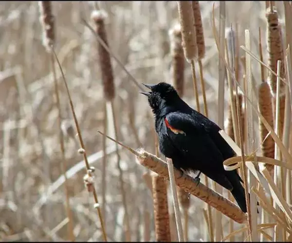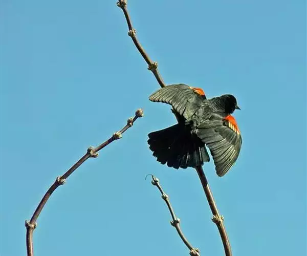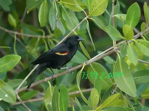 红翅黑鹂,是美洲黑鸟中最出名的是红翅黑鸟,体长19-24厘米,翼展30-37厘米,体重65克,春天雄鸟羽色翅膀上端橘红色连带小块白色,似大帅的红色肩章,头部及爪呈深蓝光泽,所有的羽毛都呈蓝黑色,因雄鸟肩翅呈现鲜艳的红色而得名。秋天羽毛边缘会变成锈色,大都生活在北美沼泽地带。