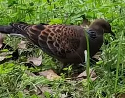 欧斑鸠体长27厘米,是一种体型略小的粉褐色斑鸠。颈侧具多黑白色细纹的斑块,翼覆羽深褐,…