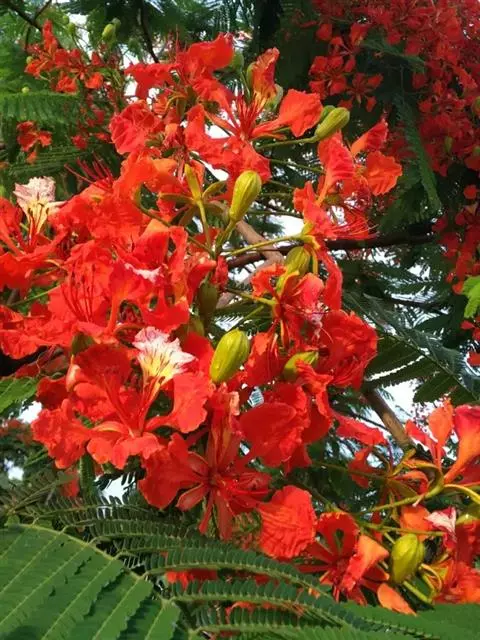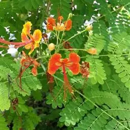 洋金凤 Sw.),豆科小凤花属灌木状或小乔木植物,枝无毛,绿或粉绿色;二回羽状复叶;总状花序伞房状,…