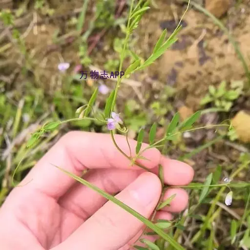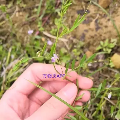 一年生缠绕草本,高20-60厘米。茎纤细柔软有棱,多分支,被微柔毛 。偶数羽状复叶,长2-4厘米;顶端为卷须,托叶箭头形或半三角形,长0.2-0.3厘米;小叶2-6对,长圆形或线形,长0.6-0.7厘米,宽约0.3厘米,先端圆,具短尖头,基部楔形。总状花序长约3厘米,花1-2朵着生于花序轴先端,花甚小,仅长约0.3厘米;花萼斜钟状,长约0.3厘米,萼齿圆三角形;花冠淡蓝色或带蓝、紫白色,旗瓣长圆倒卵形,长约0.6厘米,宽0.3厘米,翼瓣与龙骨瓣近等长;子房长圆形,长约0.3-0.4厘米,宽约0.15厘米,有柄,胚珠4,花柱上部四周被毛。荚果长圆形,长0.8-1.2厘米,宽0.2-0.4厘米,表皮棕黄色,近革质,具网纹。种子4,扁圆形,直径约0.2厘米,种皮褐色,种脐白色,长相当于种子周长1/4。花期3-6月,果期6-8月。