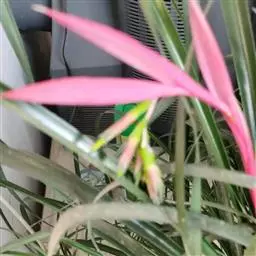 水塔花(Billbergia pyramidalis Lindl.) 凤梨科多年生常绿草本多浆植物,茎甚短。叶阔披针形,急尖,边缘有细锯齿,硬革质,鲜绿色,表面有厚角质层和吸收鳞片。穗状花序直立,高出叶丛,苞片粉红色,花冠朱红色,花瓣外卷,边缘带紫色。叶片从根茎处旋叠状丛生,基部呈莲座状,中心呈筒状。多于冬春季开花。叶片革质;青翠而光泽,丛生成莲座状,端庄秀丽;叶基部相互抱合,使植株中心成筒状,内可盛水而不漏,状似水塔,故得名"水塔花"。