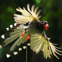 蓝绿鹊:中型鸟类,共有5个亚种。体长36-38厘米。尾长,嘴、脚红色。通体羽色主要为草绿色,…