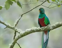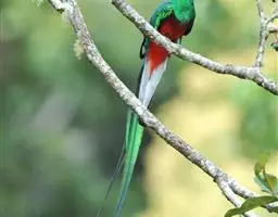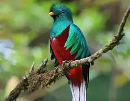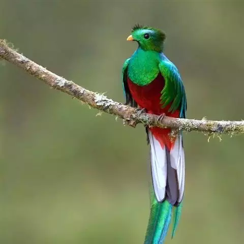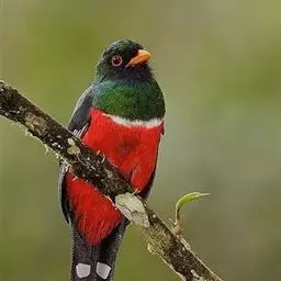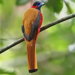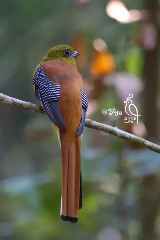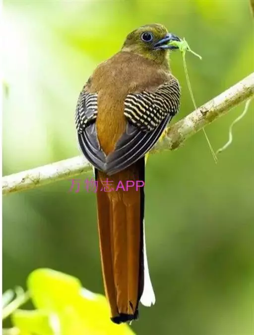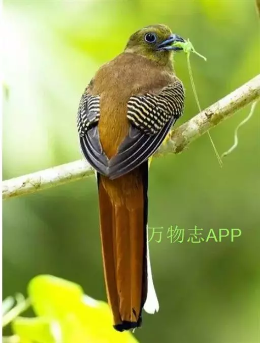橙胸咬鹃:全长约28厘米。雄鸟头、颈橄榄绿色,上体及中央尾羽栗色;中央尾羽具黑色端,…