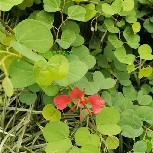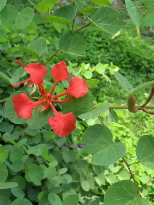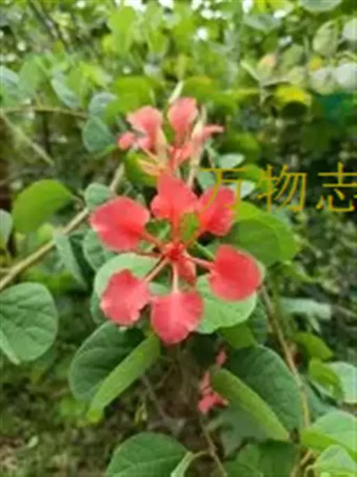 常绿攀援灌木,植株整体比较矮小;小枝顶端被微柔毛; 无卷须;叶坚纸质,宽明显大于长;先端 2 裂达叶长的的 1/5 ~ 1/2,裂片顶端钝圆;叶柄被微茸毛;聚伞花序伞房状,侧生,被锈色柔毛;花萼开花时向外反折;花瓣红色,倒匙形,有瓣柄;能育雄蕊 3 枚,退化雄蕊 7 枚;荚果长圆形,果瓣较厚,无毛;种子扁平,有光泽,直径约 8 mm;花期 4 ~ 11月;果期 7 ~ 12 月。