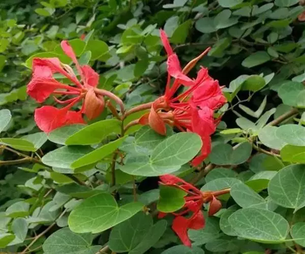 嘉氏羊蹄甲枝条细软,枝极平整,向四周匍匐伸展,冠幅常大于高度。叶呈双肾型,十分特别。花序簇生枝头,花大量,颜色橙红似火,花姿花色美妍悦目。