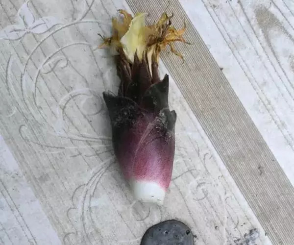 株高0.5-1米;根茎淡黄色。叶片披针状椭圆形或线状披针形,长20-37厘米,宽4-6厘米,叶面无毛,叶背无毛或被稀疏的长柔毛,顶端尾尖;叶柄长0.5-1.7厘米或无柄;叶舌膜质,2裂,长0.3-1.2厘米。穗状花序椭圆形,长5-7厘米;总花梗从没有到长达17厘米,被长圆形鳞片状鞘;苞片覆瓦状排列,椭圆形,红绿色,具紫脉;花萼长2.5-3厘米,一侧开裂;花冠管较萼为长,裂片披针形,长2.7-3厘米,宽约7毫米,淡黄色;唇瓣卵形,3裂,中裂片长2.5厘米,宽1.8厘米,中部黄色,边缘白色,侧裂片长1.3厘米,宽4毫米;花药、药隔附属体各长1厘米。果倒卵形,熟时裂成3瓣,果皮里面鲜红色;种子黑色,被白色假种皮。花期:8-10月。