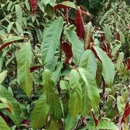 叶互生,纸质,叶片卵形或卵状披针形,稀椭圆形,长6-13厘米,宽2-5.5厘米,顶端渐尖,基部渐狭或短尖,有时钝,边缘有尖的腺状密锯齿,齿间距1-2毫米;中脉两面均凸起,背面尤著,侧脉6-10对,弧形上升,离缘2-3毫米弯拱网结,网脉明显;叶柄长2-5毫米,无腺体;托叶小,腺体状,长约0.5毫米。