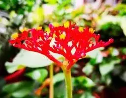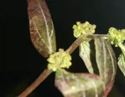 花单性,雌雄同株同序,花序顶生和腋生,长2.5-6厘米,雌花生于花序轴下部,雄花生于花序轴上部。雄花:花梗极短;苞片阔卵形或三角形,长约1. 3毫米,宽约1.5毫米,顶端凸尖,基部两侧各具一近圆形、直径约1毫米的腺体,每一苞片内有花2-3朵;萼片3,披针形,长约1.2毫米,宽0. 6-0.8毫米;雄蕊3枚,花药球形,比花丝长。雌花花梗极短或不明显;苞片卵形,长约2.5毫米,宽近1.5毫米,顶端芒尖,尖头长达1.5毫米,基部两侧各具一正圆形、直径约1.5毫米的腺体;小苞片2,长圆形,长约1.5毫米,顶端具不规则的3齿;萼片3,基部稍联合,卵形,长约1.5毫米,宽约1.2毫米,顶端尖,边缘有不明显的小齿;子房球形,直径约1.5毫米。