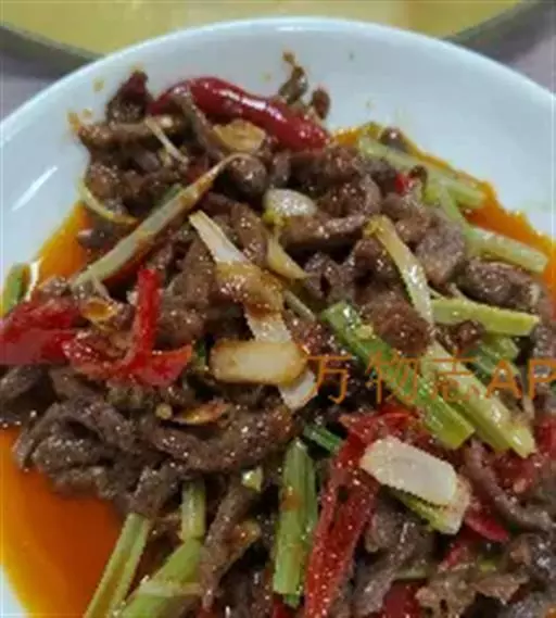 2.锅内放一匙油,烧热后,下牛肉快速翻炒到肉丝变白出锅,牛肉不一定要炒到全熟,略带生即可。