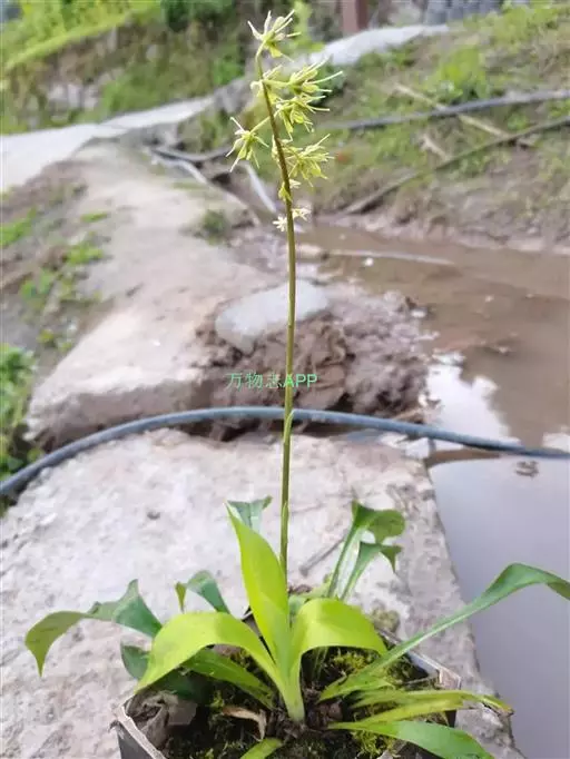 根状茎粗约1厘米,长1-5厘米。叶宽(0.6-)1.5-4.8厘米,连柄长6-27厘米。花葶通常比叶长,较少短于叶,长7-52厘米;总状花序具几朵至二十几朵花,花梗比花被稍长;花被片白色、淡红色至紫色,近匙状倒披针形,长6-10毫米,3-5脉;雄蕊长10-18毫米,至少有1/3伸出花被;子房上部3裂约达1/3-2/5,花柱长16-20毫米,稍高于雄蕊,在果期则明显高出雄蕊之上,柱头小,头状,稍3裂。蒴果长约为宿存的花被片的1/2-2/3。种子细梭状,两端有长尾,连尾长4-5毫米。花期3-4月,果期5-6月。