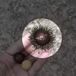 壳斗杯形,包着坚果1/3-1/2,直径1.5-1.8 厘米,高0.8-1.5厘米,壳斗外壁小苞片三角状卵形,呈半球形瘤状突起,密被灰白色短绒毛,伸出口部边缘呈流苏状。坚果卵形至长卵形,直径1.3-1.8厘米,高2-2.3厘米,无毛,果脐微突起。花期4-5月,果期9月。