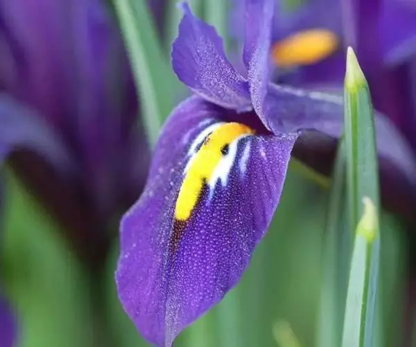 花茎短,一般不伸出地面;苞片2-3枚,草质,绿色,狭披针形,长6-8厘米,宽0.8-1厘米,顶端长渐尖,其中包含1-2朵花;花蓝色带有黄斑,直径约3厘米;花梗较短,长约1.5厘米;花被管细长,长4-5 厘米,外花被裂片狭倒披针形,长约3厘米,宽约5毫米,上部向外反折,爪部狭楔形,呈沟状,内花被裂片狭倒披针形,长约2厘米,宽2-3毫米,直立;雄蕊长1.5-1.8厘米,花药黄色或黄褐色;花柱分枝较花被裂片略短而狭,顶端裂片丝状,狭三角形,子房细圆柱形,长约1厘米。蒴果长圆形,长约2厘米,直径7-8毫米,有6条突起的肋,顶端有短喙。花期5月,果期6-8月。