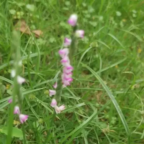 圆锥花序从叶腋发出,比叶长或多少等长,密生许多小花;花序柄和具肋棱的花序轴紫褐色,纤细;花苞片小,卵状三角形,长约1毫米,先端急尖;花梗和子房紫红色,长3毫米,子房膨大,较长;花不甚开展;中萼片紫红色,卵形,长1.5-2.2毫米,宽1-1.2毫米,先端钝,具1条脉;侧萼片紫红色,近唇瓣的一侧边缘白色,稍斜卵形,长2-2.5毫米,宽1.1-1.4毫米,先端钝,在背面中肋稍隆起呈龙骨状。