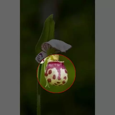 花瓣紫红色,倒卵状楔形,长1.1-1.5毫米,宽约1毫米,先端截形而其中央凹缺,具1条脉;唇瓣匙形,3裂;侧裂片紫红色,直立,半卵形,长1.5毫米,宽约1毫米;中裂片白色,厚肉质,匙形,向前伸展,长2-2.5毫米,宽1.7-2.1毫米,先端钝,基部具短爪;距紫红色,与子房平行,圆锥形,长约2毫米,粗1.5毫米,末端钝;距口前方具1个肉质舌状物伸入距内;蕊柱黄褐色,长约0.8毫米;蕊喙2裂,其裂片很短小,先端钝;药帽黄褐色,前端伸长为先端钝并且向上翘起的三角形。