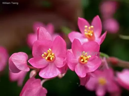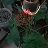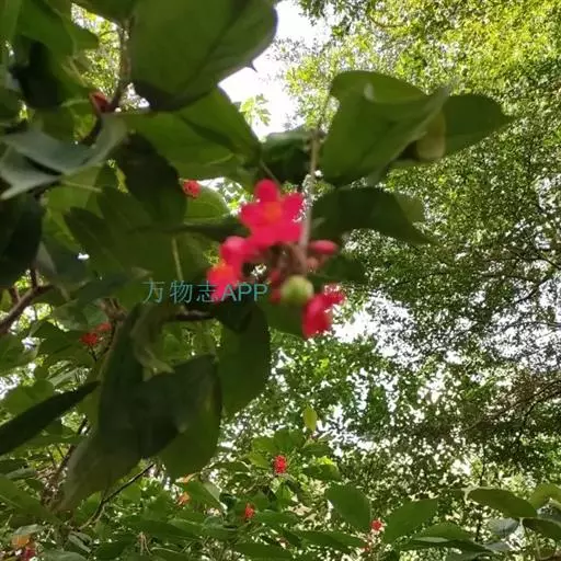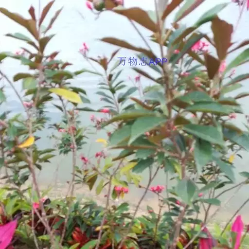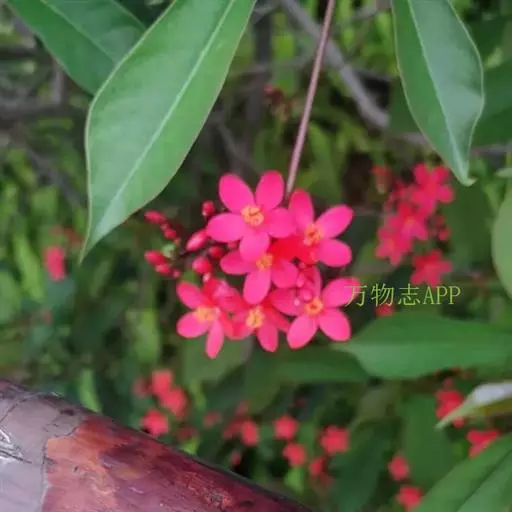 聚伞花序,花瓣5片,花冠红色;且为单性花,雌雄同株,自着生于不同的花序上;另有粉红品种。蒴果成熟时呈黑褐色。