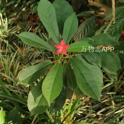 常绿灌木,花红色,植物体有乳汁,乳汁有毒。单叶互生,倒阔披针形,常丛生于枝条顶端。叶基有2-3对锐刺,叶端渐尖,叶面为浓绿色,叶背为紫绿色,叶柄具茸毛,叶面平滑。