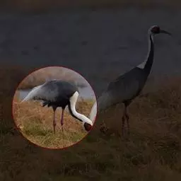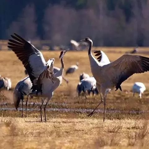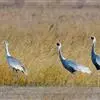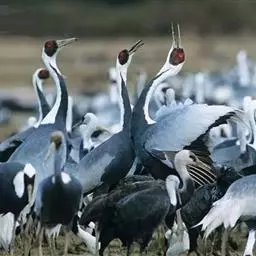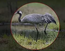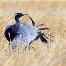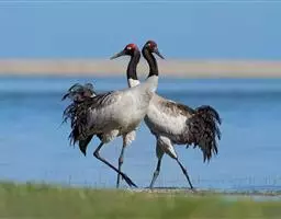 蓑羽鹤大型涉禽,体长68~92厘米,是鹤类中个体最小者。通体蓝灰色,眼先、头侧、喉和前颈黑色,…