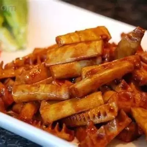 油焖竹笋是一道色香味俱全的名菜,属于浙菜系。竹笋去掉老根和笋衣,切成寸段,放入开水锅中,…