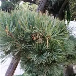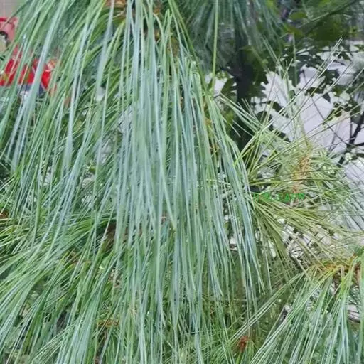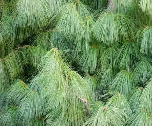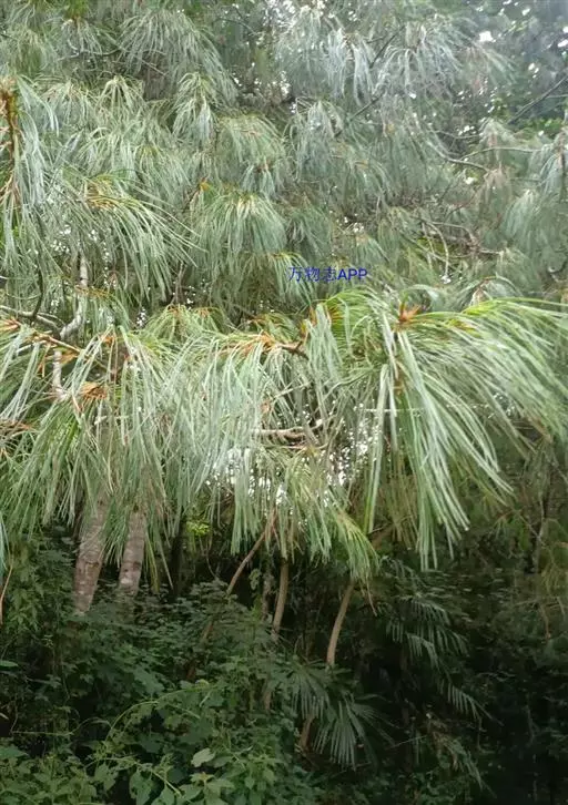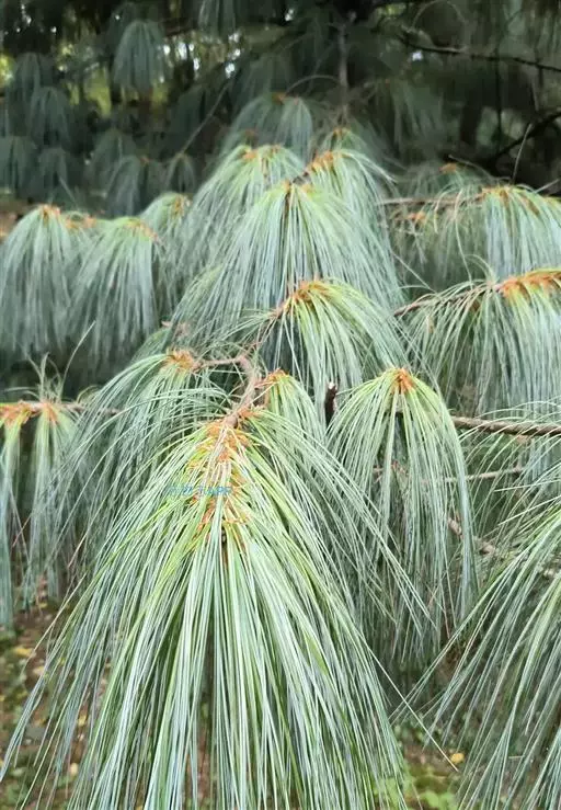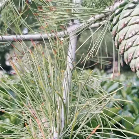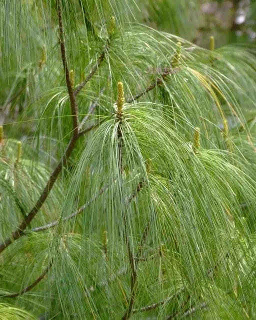 乔松 乔木,高达70米,胸径1米以上;树皮暗灰褐色,裂成小块片脱落;枝条广展,形成宽塔形树冠; 一年生枝绿色(干后呈红褐色),无毛,有光泽,微被白粉;冬芽圆柱状倒卵圆形或圆柱状圆锥形,顶端尖,微有树脂,芽鳞红褐色,渐尖,先端微分离。针叶5针一束,细柔下垂,长10-20厘米,径约1毫米,先端渐尖,边缘具细锯齿,背面苍绿色,无气孔线,腹面每侧具4-7条白色气孔线;横切面三角形,单层皮下层细胞,在背面偶尔出现单个或2-3个细胞宽的第二层细胞,树脂道3个,边生,稀腹面1个中生。球果圆柱形,下垂,中下部稍宽,上部微窄,两端钝,具树脂,长15-25厘米,果梗长2.5-4厘米,种鳞张开前径3-4厘米,张开后径5-9厘米;中部种鳞长3-5厘米,宽2-3厘米,鳞盾淡褐色,菱形,微成蚌壳状隆起,有光泽,常有白粉,上部宽三角状半圆形,边缘薄,两侧平,下部底边宽楔形,鳞脐暗褐色,薄,微隆起,先端钝,显著内曲;种子褐色或黑褐色,椭圆状倒卵形,长7-8毫米,径4-5毫米,种翅长2-3厘米,宽8-9毫米。花期4-5月,球果第二年秋季成熟。
