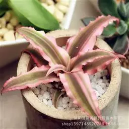 花序于叶丛中抽出,状如松球,长6-8厘米,结果时增大;苞片基部绿色,上半部淡红色,三角状卵形;萼片宽卵形,肉质,顶端带红色,长约1厘米;花瓣长椭圆形,端尖,长约2厘米,上部紫红色,下部白色。