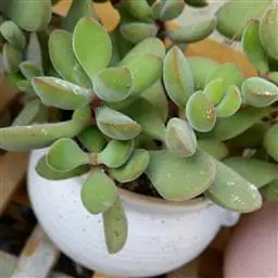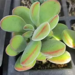 植株丛生,有细小的分枝,茎肉质,时间养久了茎会逐渐半木质化,和钱串景天长的比较像,二者的区别是大小的区别,小米星比钱串小很多,植株肉质叶灰绿至浅绿色,叶缘稍具红色,在晚秋和早春,温差大的时候红色尤为明显。叶片交互对生,卵圆状三角形,无叶柄,基部连在一起,新叶上下叠生,成叶上下有少许间隔。