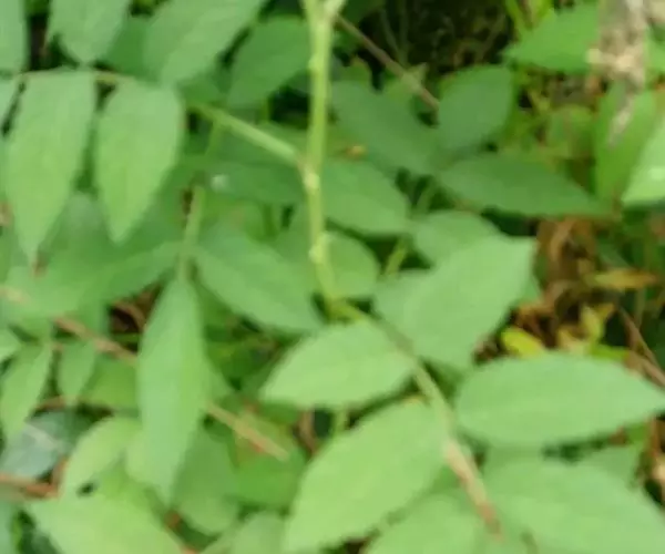 灌木,高2-3米;茎直立或匍匐状;小枝幼时有短柔毛,具扁平皮刺。单数羽状复叶,小叶5-7,披针形或卵状披针形,长3-5厘米,宽1-1.8厘米,边缘具尖重锯齿,下面散生柔毛,沿中脉有皮刺,两面均有腺点,侧脉8-10对;叶柄和叶轴散生少数皮刺和柔毛。花1-2朵,生于叶腋;花梗长1-2.5厘米,无毛,散生皮刺,有时具腺毛;花白色,直径约3厘米。聚合果矩圆形,长12-15毫米,红色,有光泽。