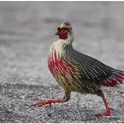 血雉雉科血雉属鸟类,别名血鸡、松花鸡,血雉的雄鸟大覆羽、尾下覆羽、尾上覆羽、脚、头侧、腊膜为红色,…