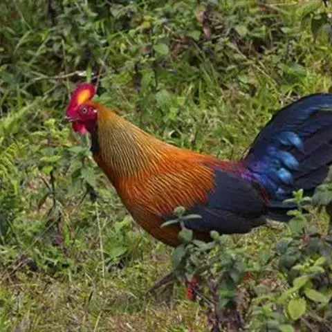 黑尾原鸡:雄鸟体型较大,体羽艳丽且金属光泽;脸部裸皮、有红色肉冠及肉垂,大而显著;中央两枚尾羽延长…
