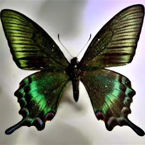 巴黎翠凤蝶中型凤蝶,躯体黑褐色,散布绿色亮鳞。后翅M3脉端有一明显叶状尾突。翅背面底色黑褐色,密布…