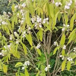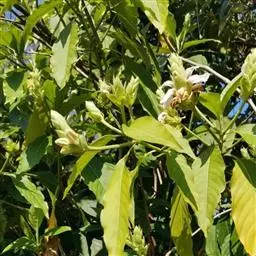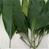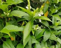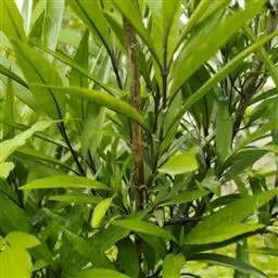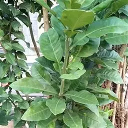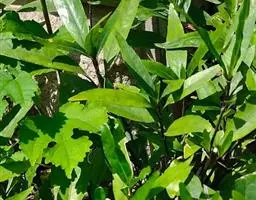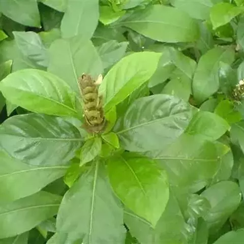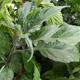 叶具柄,卵形、距圆形至卵状披针形,长9-15厘米,宽4.5-8.5厘米,顶端渐尖,基部阔楔形,下延,边全缘或微波状,侧脉每边6条,上面深绿色,背面淡绿色,侧脉在背面凸起,明显。