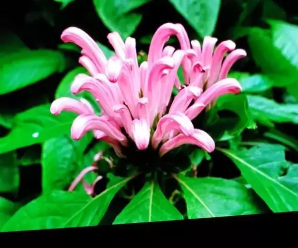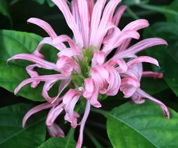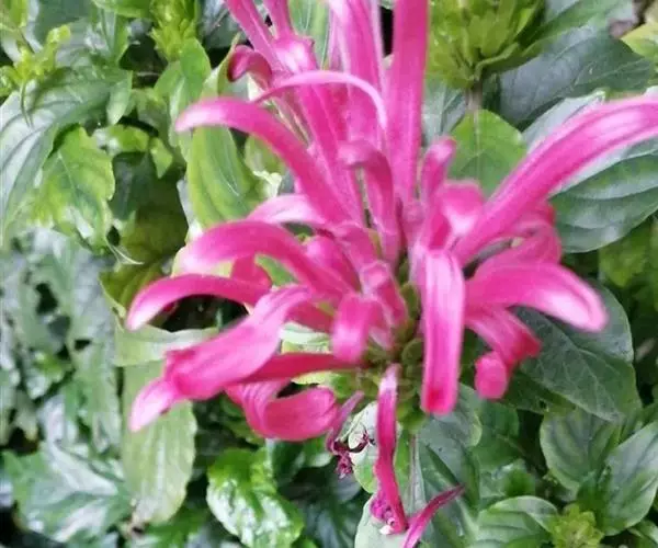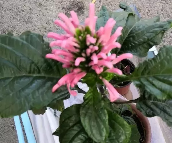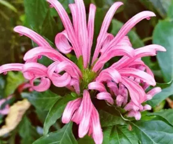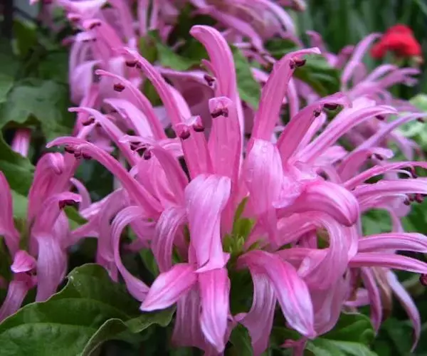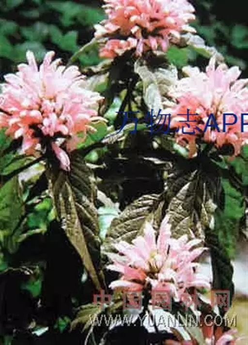 穗状花序组成的圆锥花序穗状,顶生,长达8厘米,脱落时真整个花序连同下部叶状苞片一起脱落;苞片矩圆形,长约2厘米,顶端急尖,基部楔形,具柄,边缘有缘毛;小苞片,条形,长1.5厘米,宽2毫米;花萼裂片,条状披针形,近等大,长0.6-1厘米;花粉红紫色,长约5厘米,具黏毛,唇形,花冠筒稍短或与唇瓣等长,上唇顶端微凹,下唇反转,顶端浅裂;雄蕊,外露,着生于喉部,花丝丝状,长2.5厘米,药室不等高,药隔宽。