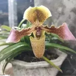 硬叶兜兰(学名:Paphiopedilum micranthum T. Tang et F. T. Wang )是兰科、兜兰属的国家一级保护植物。地生或半附生植物。叶基生;数枚至多枚,叶片带形、革质。花葶从叶丛中长出,花苞片非叶状;子房顶端常收狭成喙状;花大而艳丽,有种种色泽;中萼直立,花粉粉质或带粘性,退化雄蕊扁平;柱头肥厚,下弯,柱头面有乳突,果实为蒴果。兜兰花比较雅致,色彩比较庄重,色及带有不规则斑点或条纹。花瓣较厚,花朵开放期比较长。