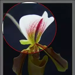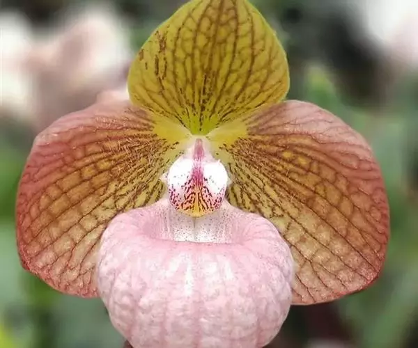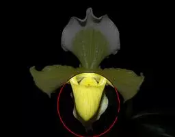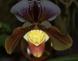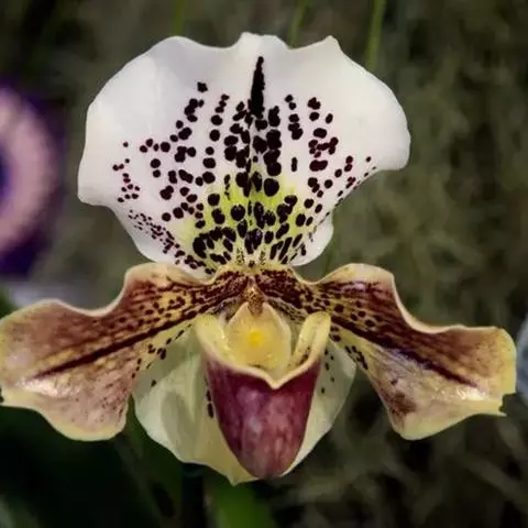 花葶直立,长10-26厘米,紫红色而有深色斑点,被长柔毛,顶端具1花;花苞片卵形或宽卵形,绿色而有紫色斑点,长1-1.4厘米,背面疏被长柔毛;花梗和子房长3.5-4.5厘米,被长柔毛;花大,艳丽,中萼片与花瓣通常白色而有黄色晕和淡紫红色粗脉纹,唇瓣白色至淡粉红色,退化雄蕊黄色并有淡紫红色斑点和短纹;中萼片卵形或宽卵形,长2-3厘米,宽1.8-2.5厘米,先端急尖,背面被长柔毛并有龙骨状突起;合萼片卵形或宽卵形,长2-2.8厘米,宽1.8-2.8厘米,先端钝或急尖,背面被长柔毛并具2条稍钝的龙骨状突起;花瓣宽卵形、宽椭圆形或近圆形,长2.8-3.2厘米,宽2.6-3.5厘米,先端钝或浑圆,内表面基部具白色长柔毛,背面多少被短柔毛;唇瓣深囊状,卵状椭圆形至近球形,长4.5-6.5厘米,宽4.5-5.5厘米,基部具短爪,囊口近圆形,整个边缘内折,囊底有白色长柔毛;退化雄蕊椭圆形,长1-1.5厘米,宽7-8毫米,先端急尖,两侧边缘尤其中部边缘近直立并多少内弯,使中央貌似具纵槽;2枚能育雄蕊由于退化雄蕊边缘的内卷而清晰可辨,甚为美观。花期3-5月。