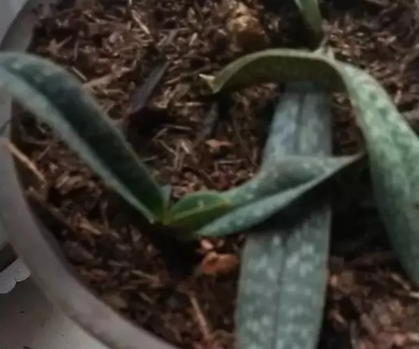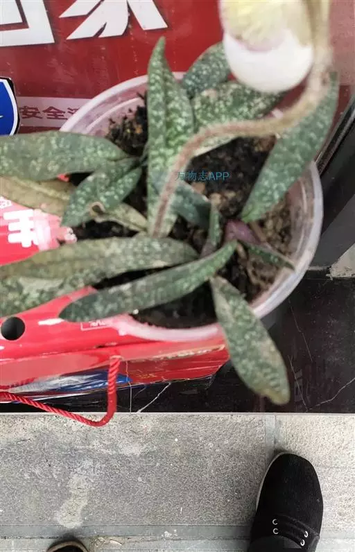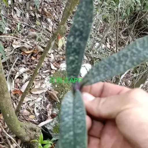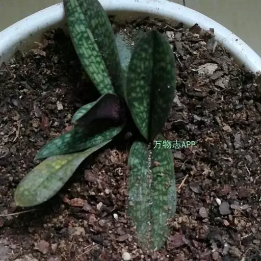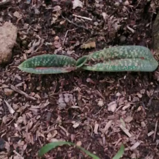 叶基生,二列,4-5枚;叶片长圆形或舌状,坚革质,长5-15厘米,宽1.5-2厘米,先端钝,上面有深浅绿色相间的网格斑,背面有密集的紫斑点并具龙骨状突起,基部收狭成叶柄状并对折而彼此套叠。