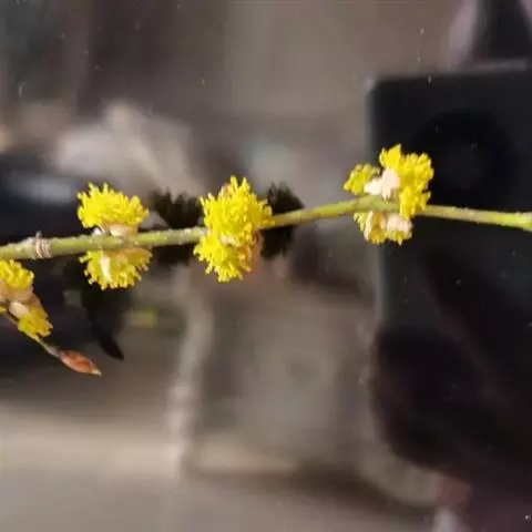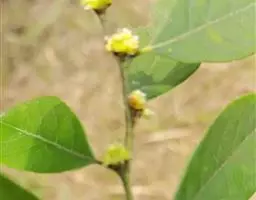 具纵条纹,绿色,干时棕褐色,或疏或密被黄白色短柔毛,基部有密集芽鳞痕,一年生枝条粗壮,无毛,皮层不规则纵裂。顶芽卵形,长约5毫米。叶互生,通常披针形、卵形或椭圆形,长(3)4-9(12.5),宽(1)1.5-3(4.5)厘米,先端渐尖、急尖、骤尖或有时近尾尖,基部宽楔形或近圆形;薄革质至厚革质;上面绿色,无毛,下面灰绿或浅黄色,被黄褐色柔毛,后渐脱落成疏柔毛或无毛,边缘内卷;羽状脉,侧脉每边5-7条,弧曲,与中脉上面凹陷,下面突起,被黄褐色微柔毛或近无毛;叶柄长5-8毫米,被黄褐色微柔毛或近无毛。伞形花序具5-8朵花,单生或二个同生于叶腋,总梗极短;总苞片4,早落。雄花黄色,直径达4毫米,花梗长2-2.5毫米,略被金黄色微柔毛;花被片6,卵形,近等大,长约3毫米,宽1.5毫米,先端圆形,外面略被金黄色微柔毛或近无毛;雄蕊9,长2.5-3毫米,花丝略被微柔毛或无毛,与花药等长,第三轮基部有2具角突宽肾形腺体;退化雌蕊的子房卵形,长约1毫米,无毛,花柱、柱头不分,成一短凸尖。雌花黄色或黄白色,花梗长2-2.5毫米;花被片6,卵形,长2毫米,外面被微柔毛;退化雄蕊9,条形,长1.5毫米,第三轮有2个腺体;子房椭圆形,长1.5毫米,无毛,花柱长2毫米,柱头盾形,具乳突。果卵形,长约1厘米,宽7-8毫米,也有时略小而近球形,无毛,成熟时红色;果梗长4-7毫米,被黄褐色微柔毛。花期3-4月,果期9-10月。