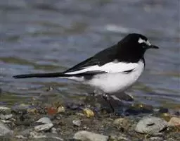 日本鹡鸰:体长约20厘米。上体多黑色,额、颏及眉纹白,下体白,两翼黑而具白色横斑及羽缘,…
