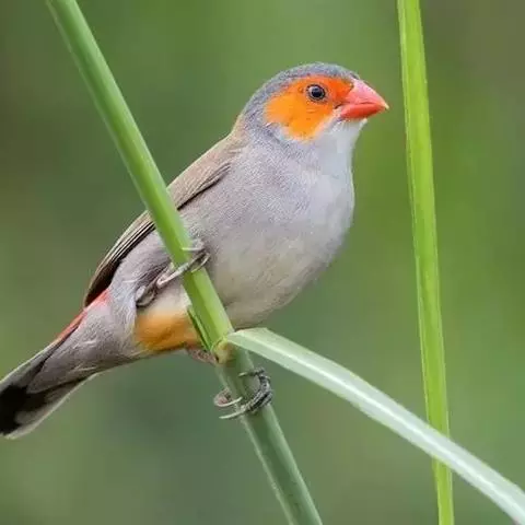 橙颊梅花雀体长约10厘米,头部灰色,两侧有大块橙色区域,嘴基及眼下方有黑纹,两条黑纹间呈白色,…