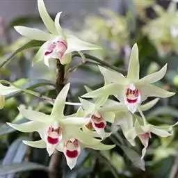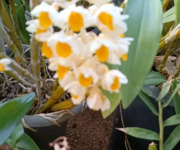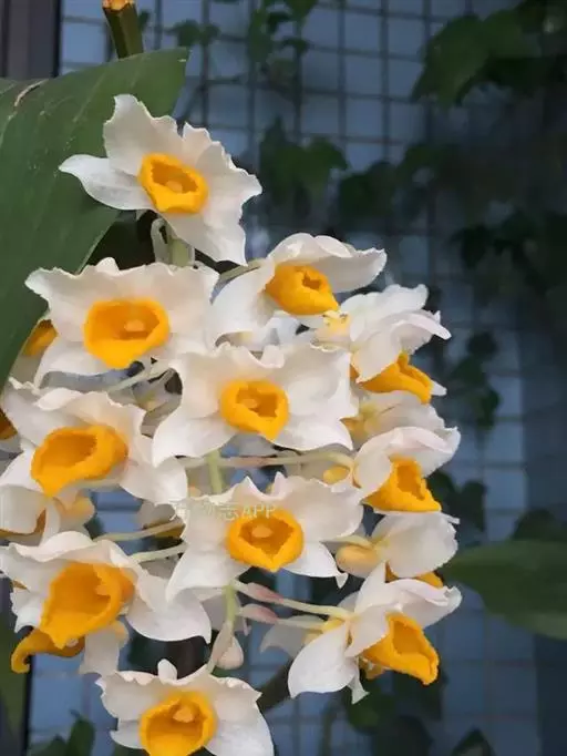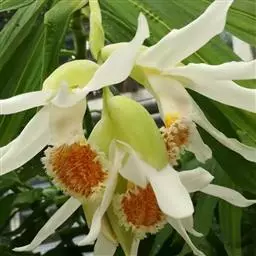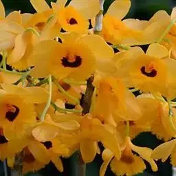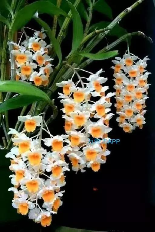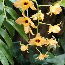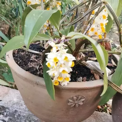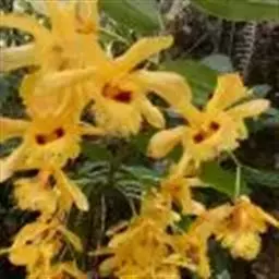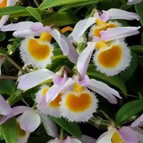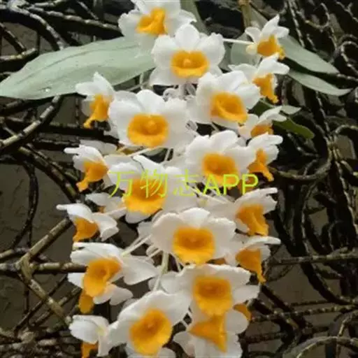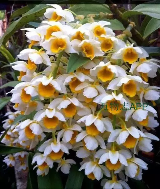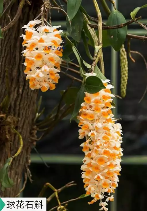 球花石斛(学名:Dendrobium thyrsiflorum Rchb. f.):茎直立或斜立,圆柱形,粗状,不分枝,具数节,黄褐色并且具光泽,有数条纵棱。叶3-4枚互生于茎的上端,革质,长圆形或长圆状披针形。总状花序侧生于带有叶的老茎上端,下垂,长10-16厘米,密生许多花,花开展,质地薄,萼片和花瓣白色;花瓣近圆形,长14毫米,宽12毫米,先端圆钝,基部具长约2毫米的爪,具7条脉和许多支脉,基部以上边缘具不整齐的细齿;唇瓣金黄色,半圆状三角形,长15毫米,宽19毫米,先端圆钝,基部具长约3毫米的爪。花期4-5月。