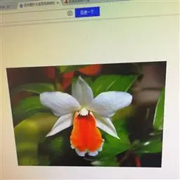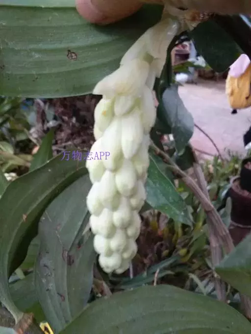 总状花序侧生于带有叶的老茎上端,下垂,长10-16厘米,密生许多花,花序柄基部被3-4枚纸质鞘;花苞片浅白色,纸质,倒卵形,长10-15毫米,宽5-13毫米,先端圆钝,具数条脉,干后不席卷;花梗和子房浅白色带紫色条纹,长2.5-3厘米;花开展,质地薄,萼片和花瓣白色;中萼片卵形,长约1.5厘米,宽8毫米,先端钝,全缘,具5条脉;侧萼片稍斜卵状披针形,长1.7厘米,宽7毫米,先端钝,全缘,具5条脉;萼囊近球形,宽约4毫米。