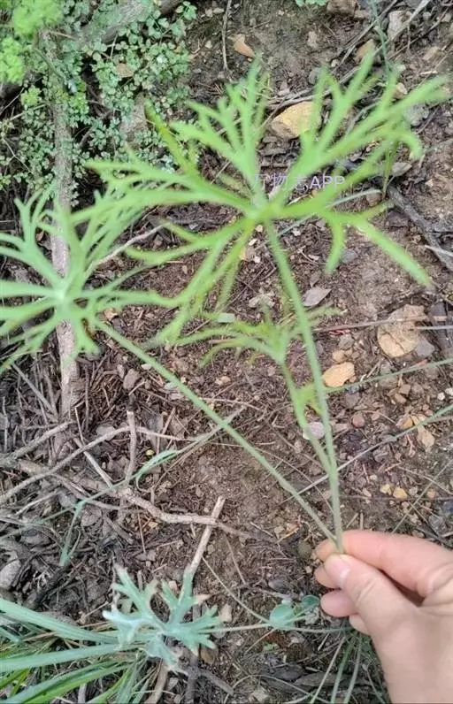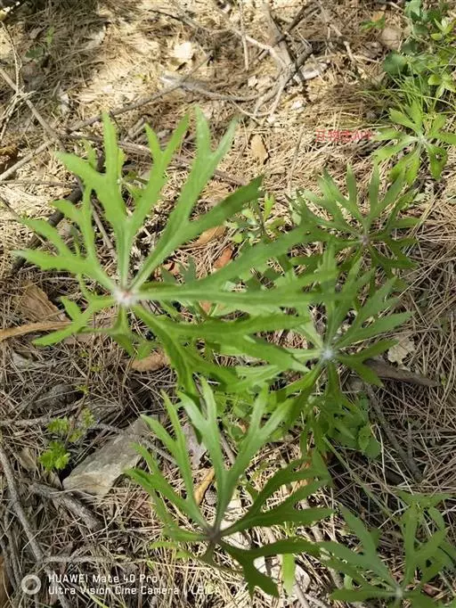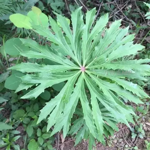 多年生草本。几根状茎短,横走,具多数须根,茎直立,高70-120厘米,下部直径2.5-6毫米,紫褐色,无毛,具纵肋,不分枝。叶通常2,疏生;下部叶具长柄;叶片盾状圆形,直径20-30厘米,掌状深裂;裂片7-9,每裂片再次2-3浅裂;小裂片宽4-8毫米,线状披针形,边缘具不等长的锐齿,顶端渐尖,初时反折呈闭伞状,被密蛛丝状绒毛,后开展成伞状,变无毛,上面淡绿色,下面灰色;叶柄长10-16厘米,无翅,无毛,基部抱茎;中部叶较小,直径12-24厘米;裂片通常4-5;叶柄长2-6 厘米。其余的叶呈苞片状,披针形,向上渐小,无柄或具短柄。