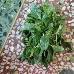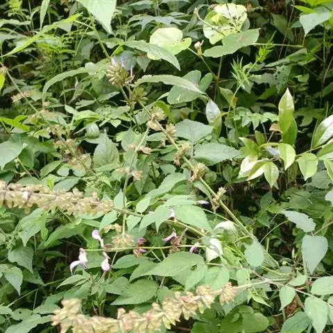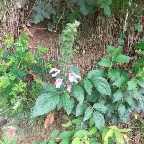 亚灌木状草本,高可达90厘米。茎钝四稜形,具浅槽,无毛。叶卵圆形或三角状卵圆形,长2.5-7厘米,宽2-4.5厘米,先端渐尖,基部截形或圆形,稀钝,边缘具锯齿,上面绿色,下面较淡,两面无毛,下面具腺点;茎生叶叶柄长3-4.5厘米,无毛。