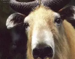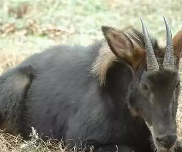 鬣羚 外形似羊,略比斑羚大,雄兽和雌兽之间的大小差别不显著。 它的体长为140~190厘米,体重50~100公斤,肩高86~110厘米,尾长9~16厘米,两只耳朵特别狭长,似驴,可达19~21厘米,端部较尖,雌雄均有一对短而尖的黑角,短而光滑,介于两耳之间,距离较远,形状较为简单,两角自额骨的后部长出后,平行而稍呈弧形往后伸展,角的横切面呈圆形,末端较尖,角的表面具有环状的棱及不规则的纵行沟纹,角尖处较为光滑,长度为20~26厘米,粗13~16厘米,最长的纪录得自喜马拉雅山地区,为32.4厘米。自角基至颈背有长十几厘米的灰白色鬣毛,甚为明显。颈背有鬃毛,吻鼻部黑色,吻端裸露,唇的周围有髭毛,有明显的球囊状眶下腺,其开口处有一撮丛毛。
