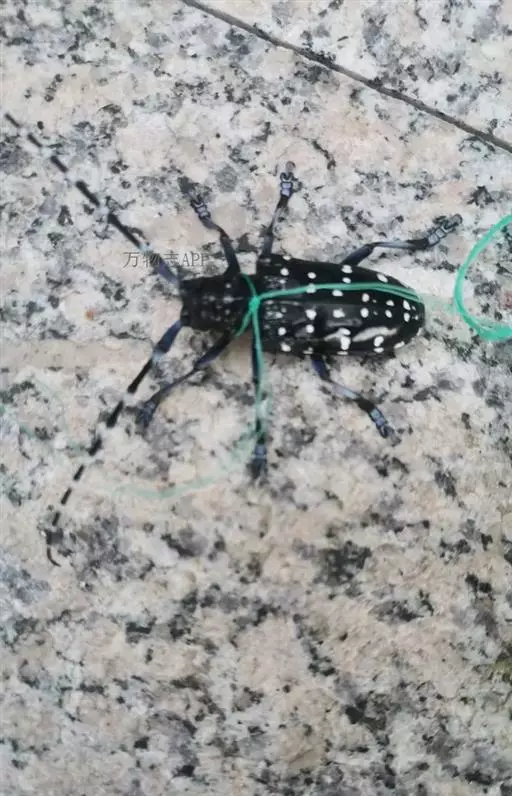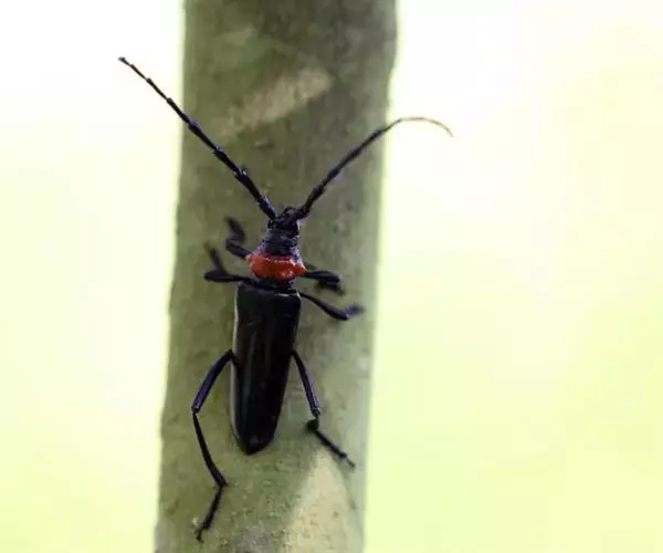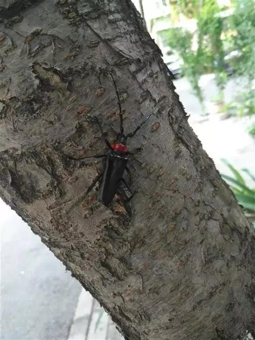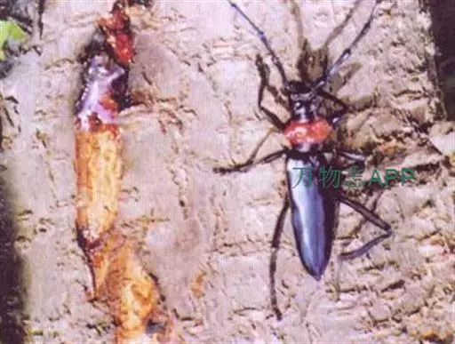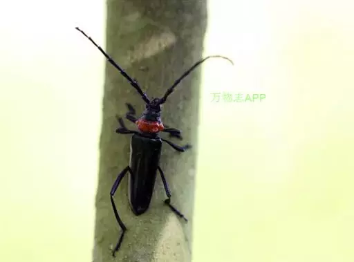 桃红颈天牛属鞘翅目,天牛科。体黑色,有光亮;前胸背板红色,背面有4个光滑疣突,具角状侧枝刺;鞘翅翅面光滑,基部比前胸宽,端部渐狭;雄虫触角超过体长4~5节,雌虫超过1~2节。它体长28~37mm。主要分布于北京、东北、河北、河南、江苏、浙江等地。