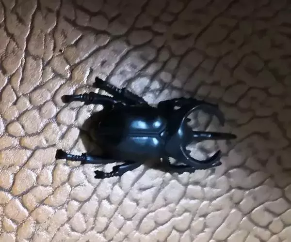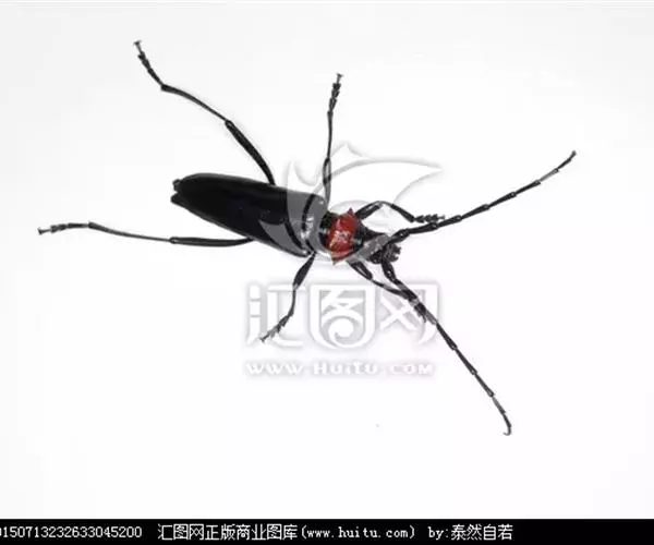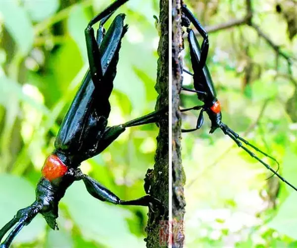 成虫:体黑色,有光亮;前胸背板红色,背面有4个光滑疣突,具角状侧枝刺;鞘翅翅面光滑,基部比前胸宽,端部渐狭;雄虫触角成虫 有两种色型:一种是身体黑色发亮和前胸棕红色的“红颈型”,另一种是全体黑色发亮的“黑颈”型。据初步了解,福建、湖北有“红颈”和“黑颈”两型的个体,而长江以北如山西、河北等地只见有“红颈”个体。成虫体长约28-37毫米,体黑色发亮,前胸背面大部分为光亮的棕红色或完全黑色。头黑色,腹面有许多横皱,头顶部两眼间有深凹。触角蓝紫色,基部两侧 各有一叶状突起。前胸两侧各有刺突一个,背面有4个瘤突。鞘翅表面光滑,基部较前胸为宽,后端较狭。雄虫身体比雌虫小,前胸腹面密布刻点,触角超过虫体5节;雌虫前胸腹面有许多横皱,触角超过虫体两节。