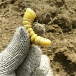 幼虫:老熟幼虫体长约42-52毫米,乳白色,前胸较宽广。身体前半部各节略呈扁长方形,后半部稍呈圆筒形,体两侧密生黄棕色细毛。前胸背板前半部横列4个黄褐色斑块,背面的两个各呈横长方形,前缘中央有凹缺,后半部背面谈色,有纵皱纹;位于两侧的黄褐色斑块略呈三角形。胸部各节的背面和腹面都稍微隆起,并有横皱纹。