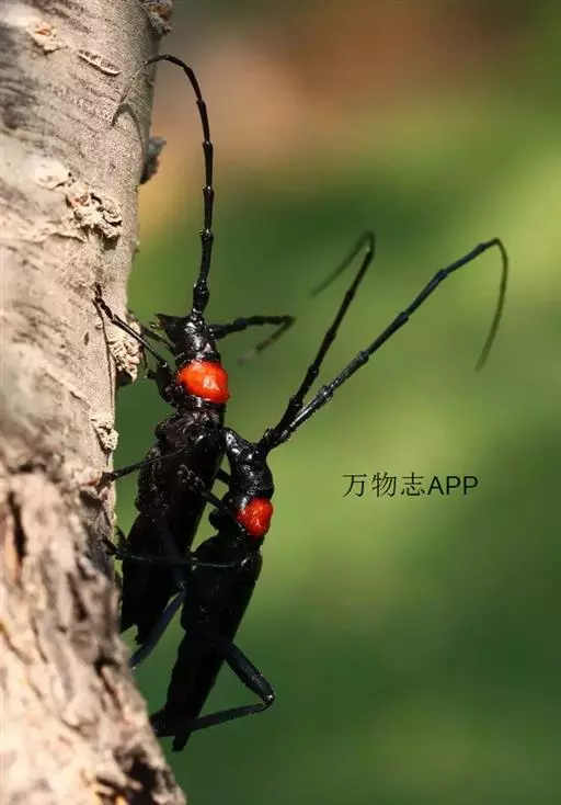 桃红颈天牛是天牛科、颈天牛属昆虫。体黑色发亮,前胸背面大部分为光亮的棕红色或完全黑色。头黑色,…