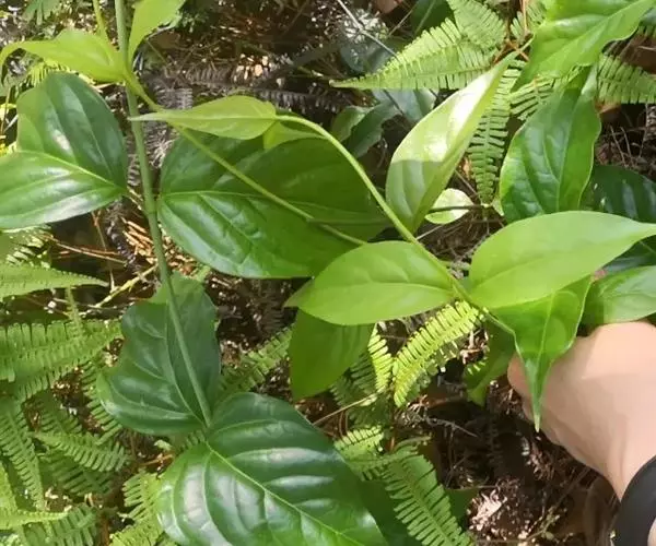 常绿木质藤本,长3-12米。小枝圆柱形,幼时具纵棱;除苞片边缘和花梗幼时被毛外,全株均无毛。叶片膜质,卵形、卵状长圆形或卵状披针形,长5-12厘米,宽2-6厘米,顶端渐尖,基部阔楔形至近圆形;侧脉每边5-7条,上面扁平,下面凸起;叶柄长6-12毫米。