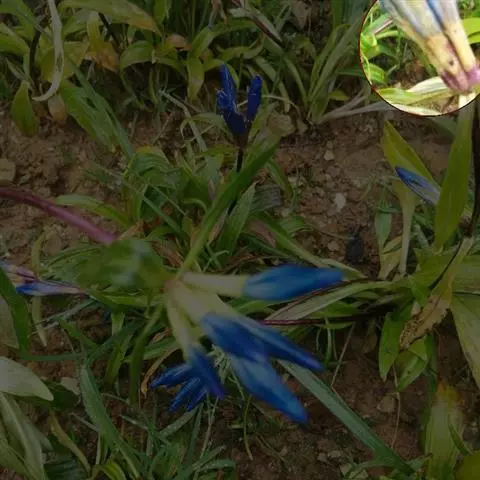 龙胆(学名:Gentiana scabra Bunge)是龙胆科、龙胆属多年生草本植物,高可达60厘米。根茎平卧或直立,具多数粗壮、略肉质的须根。花枝单生,直立,中空,近圆形,枝下部叶膜质,淡紫红色,鳞片形,先端分离,中、上部叶片近革质,无柄,卵形或卵状披针形至线状披针形,叶脉在上面不明显,在下面突起,粗糙。花多数,簇生枝顶和叶腋;无花梗;苞片披针形或线状披针形,与花萼近等长,裂片常外反或开展,线形或线状披针形,边缘粗糙,花冠蓝紫色,有时喉部具多数黄绿色斑点,筒状钟形,花丝钻形,花药狭矩圆形,子房狭椭圆形或披针形,蒴果内藏,宽椭圆形,种子褐色,有光泽,线形或纺锤形,5-11月开花结果。