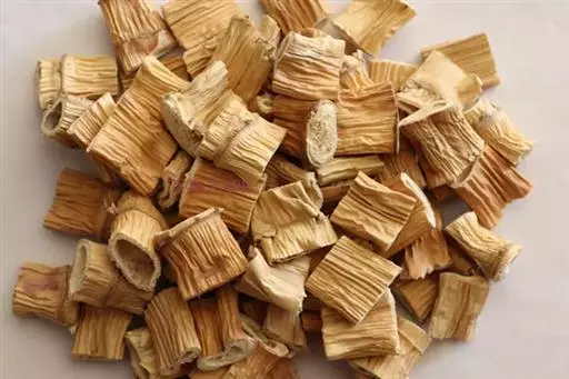 鲜根茎长圆柱形,有的略扁,长短不一,直径1-2cm。表面黄白色,有光泽,外皮疏松可剥离。节呈环状,有残根及芽痕。体轻,质韧,不易折断。折断面黄白色,中空,壁厚1-2mm,有小孔排列成环。无臭,味甘。 干根茎呈压扁的长圆柱形。表面有光泽,黄白色。节处较硬,红黄色节间有纵皱纹。质轻而柔韧。无臭,味微甘。 均以条粗均匀、色黄白、有光泽、无须根者为佳。